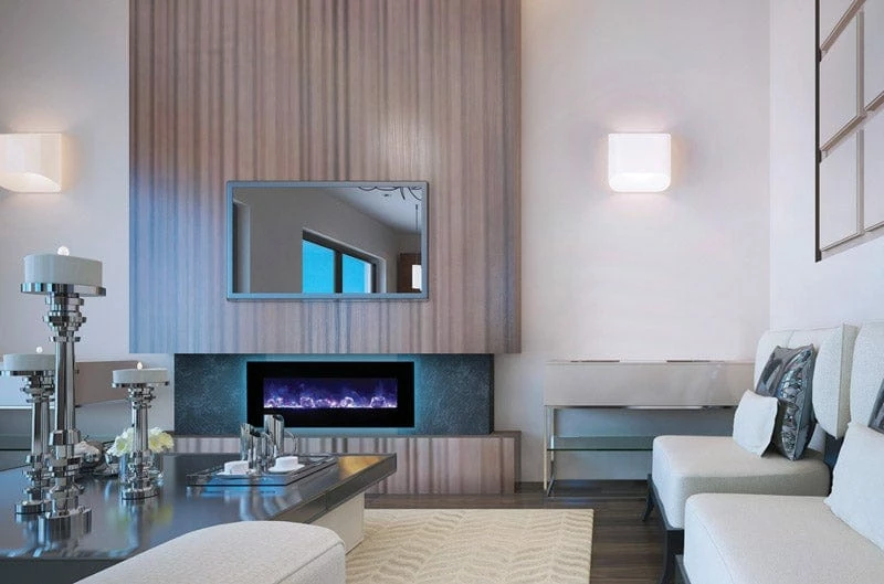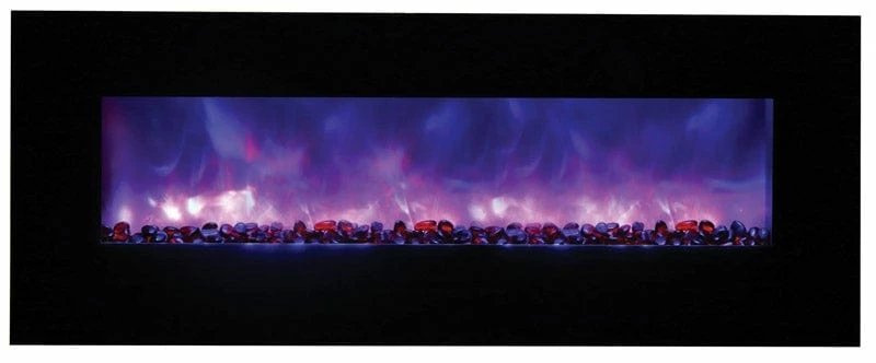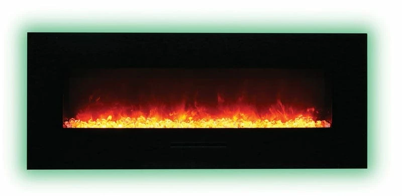 Heat is emitted from a single slot in the face of the surround. 13 colors of surround back-lighting illuminate spaces creating even more ambience. All Built-In Flush Mount / Wall Mount fireplaces come standard with a driftwood style log set and optional decorative media of EMBER or FIRE & ICE® media are available for purchase.