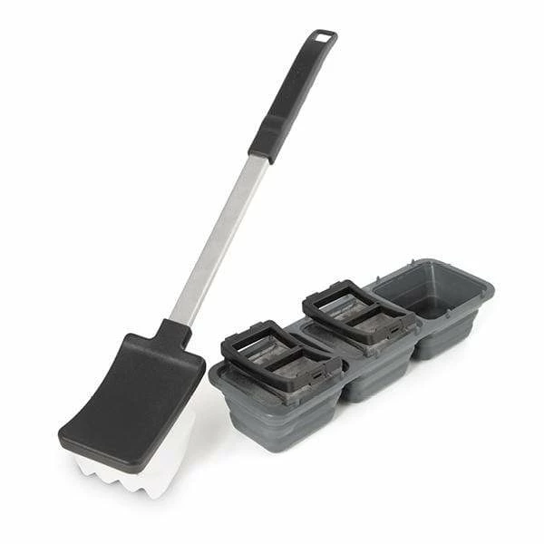 This unique grill cleaning tool uses ice to clean around grids, removing debris, without leaving any residue. Steam quickly evaporates on hot grills. Add a splash of lemon juice to the ice for an all natural de-greaser. Includes 3 ice holders and a 3 block ice tray.