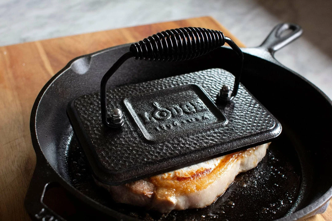On the stovetop or grill, this grill press is perfect for eliminating curl from bacon or ham, pressing unwanted fats from your burgers or sausages, and holding heat in your grilled sandwiches. The heavy-duty cast iron base has a unique hammered finish and features a safe cool-grip spiral handle. Seasoned and ready to use.