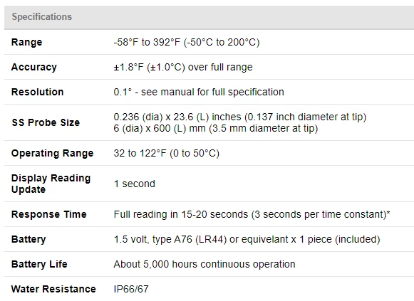 New long-stem thermometers feature a rugged T-shaped design. Easy to insert in semi-solids and easily read once inserted or immersed! Big digits, hold reading feature, MAX/MIN recall, °C/°F button and a 5,000 hour battery life. The rubber-molded key panel is waterproof and the display has a clear, hard protection window.