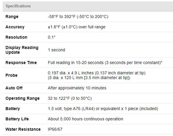 Designed for easy forcing into meats and semi-solids. However, many buy this thermometer to read liquids and soft foods because it’s tough and water resistant. Many like the large display that’s easy-to-read even when the thermometer is inserted. It’s also handy for measuring bottled liquids. The RT610B takes a lot of heavy plant useage, and the replacement rate is much lower than many products in this price range. Includes auto-off after 10 minutes.