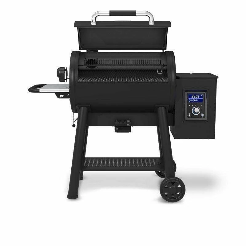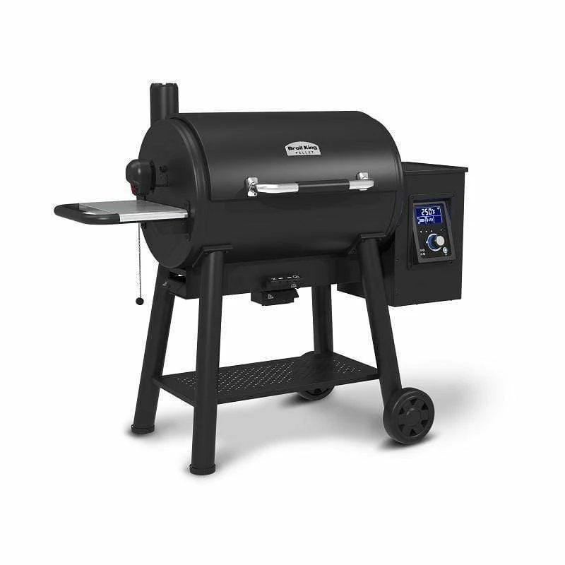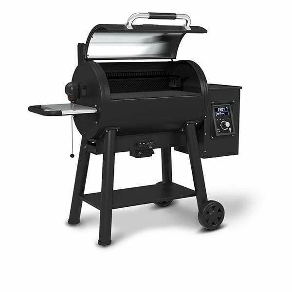 The Regal Pellet 500 Smoker And Grill pellet grill body is constructed from 2mm (14 gauge) steel, has 625 Sq.in. (4,032 Sq.cm.) of primary cooking surface, 200 Sq.in. (1,290 Sq.cm.) secondary cooking surface and heavy duty cast iron cooking grids. The Wifi and Bluetooth® enabled digital controller provides enhanced temperature control to smoke, roast or sear. The controller display panel is the easiest to read while grilling, check the competition. This innovative product comes fully equipped with a powerful auger, 22-lb capacity pellet hopper, removable grease management system, unique ash management system, deluxe rotisserie kit, 2 electronic meat probes, and base storage and side shelf.
