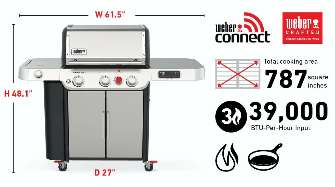 Introducing the GENESIS smart grill – the biggest grilling innovation in decades, that creates a full backyard culinary experience. Roast, bake, steam, or even stir-fry by replacing the cooking grate with custom-fit WEBER CRAFTED grillware, inspiring food never thought possible on the grill. And with WEBER CONNECT smart technology, you’ll receive real-time food temperature alerts, so that whatever you’re making turns out perfect every time.