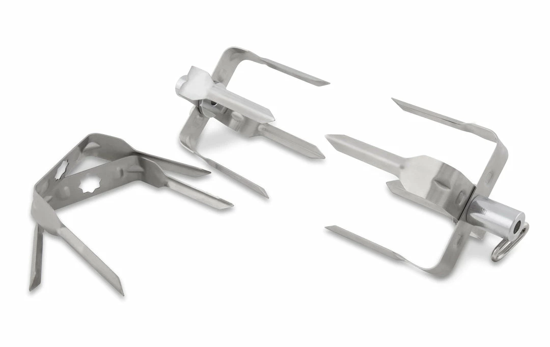 Rotisserie chickens or roast can get unruly; cooked meats tenderize and tear easily or flop around. If you don’t want to tie your meat onto the spit rod, use the mega forks. They have more hold than most meat forks to grip an entire cut of meat from start to finish. 6-C shaped forks – 4 square and 2 tapered to grab and hold on. Splined to lock into multiple positions, disassembles for easy cleanup. Fits 3/8-IN and 1/2-IN rods.