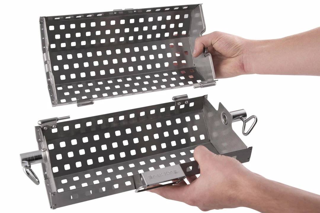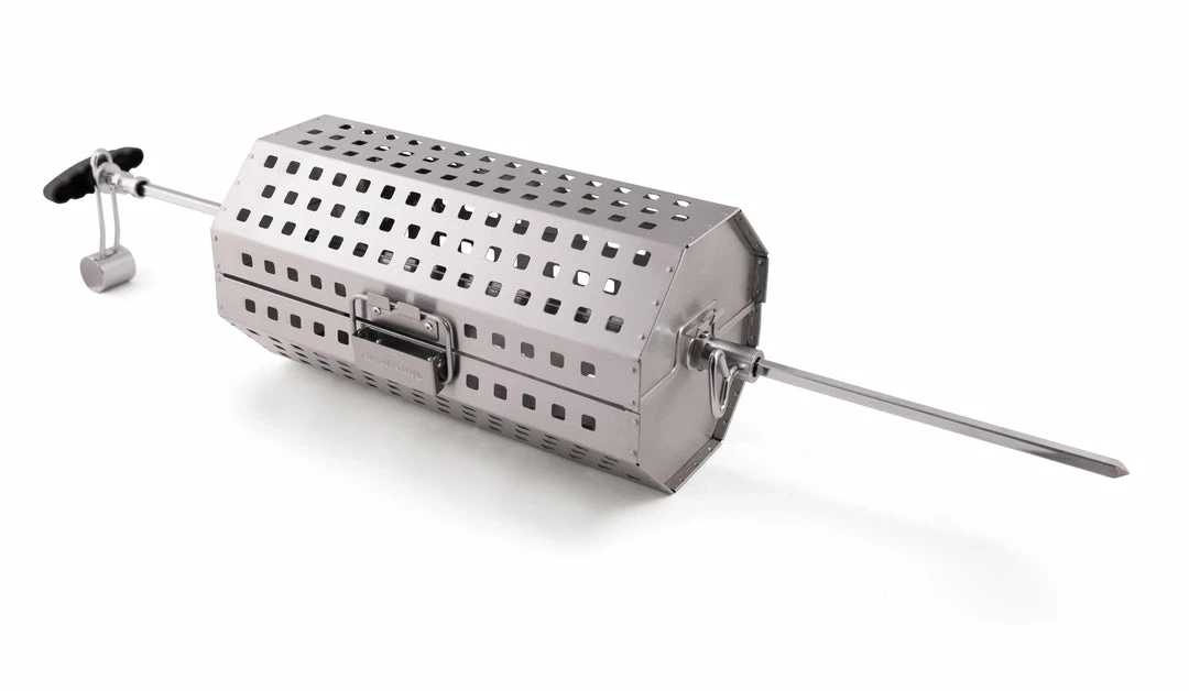 Perforated stainless steel basket wraps around rotisserie rod. Use as a tumbling basket for small food items. Basket can be separated and top portion can be used as grill top wok.