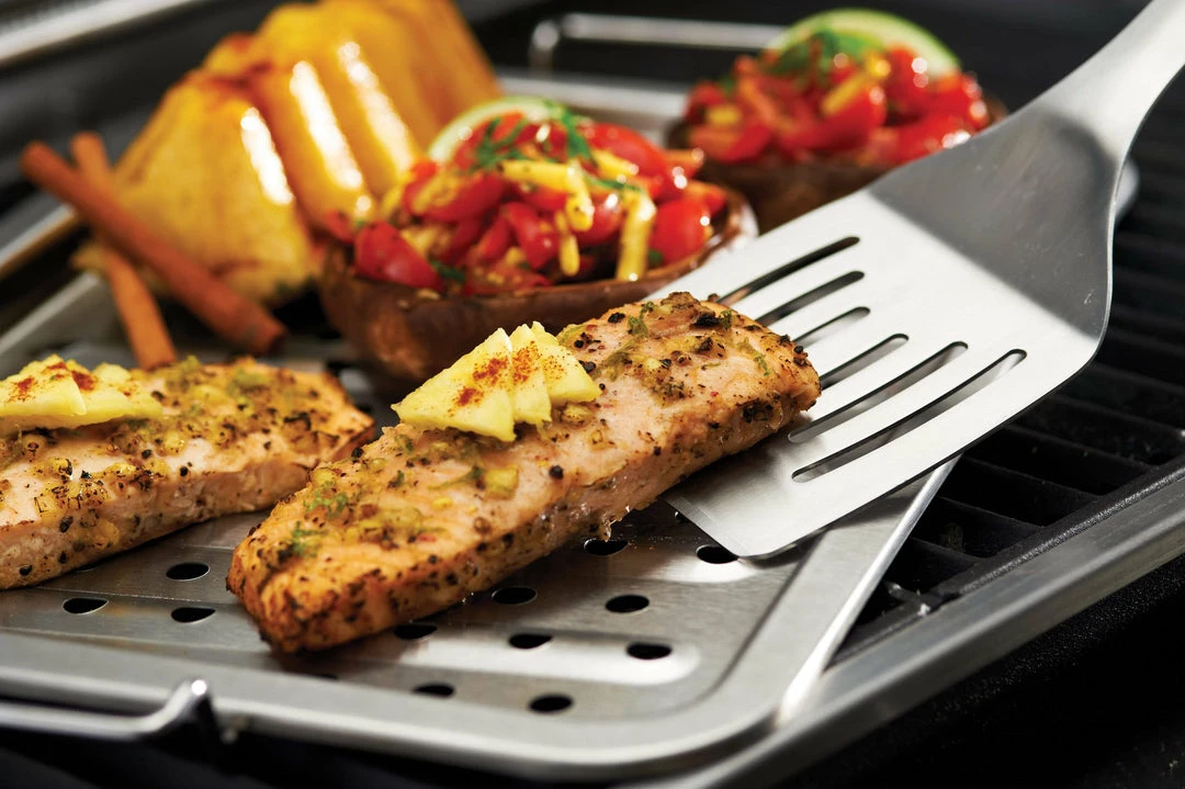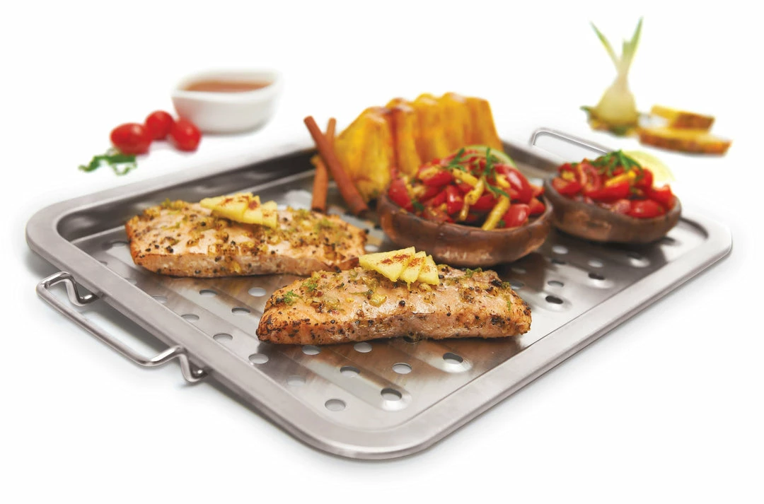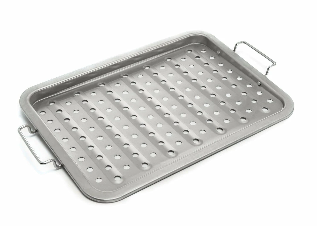 11-IN x 16-IN stainless steel grilling topper with stainless handles and raised contours. The single draw design improves functionality and rigidity, it also makes it much easier to clean.