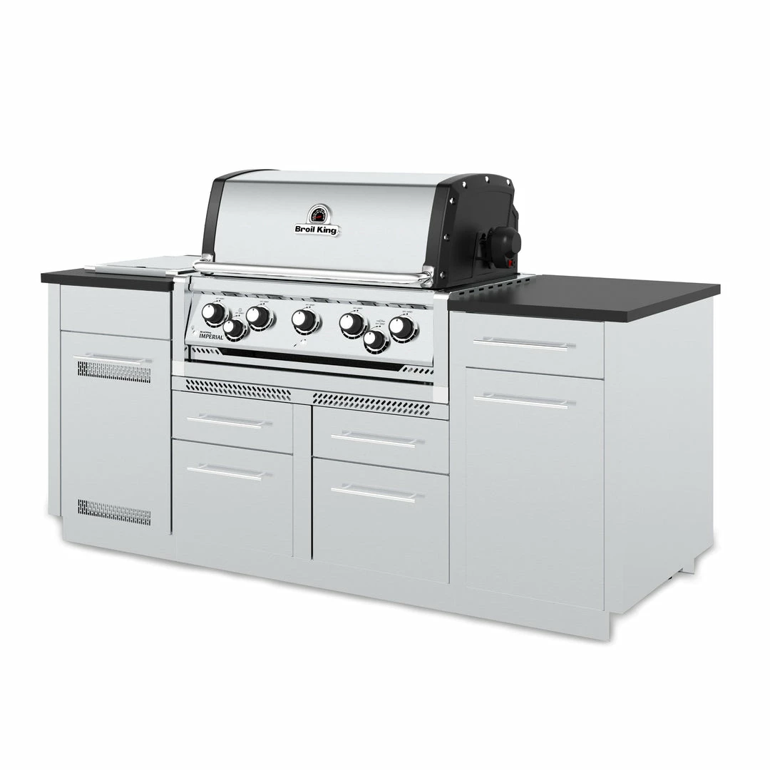 The Broil King® Imperial™ S 590i features 625 sq. in. of primary cooking surface and includes 5 stainless steel Dual-Tube™ burners, built-in oven lights, illuminated control knobs, 5 professional cast stainless steel cooking grids, stainless steel warming rack, stainless steel Flav-R-Wave™ cooking system, and electronic ignition. The S 590i features 304 stainless steel utility cabinet drawers with a tank holder (LP) and granite countertop.