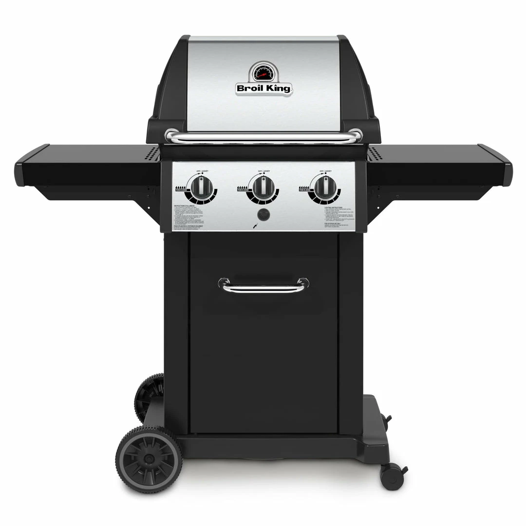 The Broil King Monarchâ„¢ 320 features 330 sq. in. primary cooking surface and includes 3 stainless steel Dual-Tubeâ„¢ burners, reversible heavy-duty cast iron cooking grids, stainless steel Flav-R-Waveâ„¢ cooking system, and electronic ignition. The Monarchâ„¢ 320 features painted steel drop-down side shelves and enclosed cabinet base.