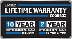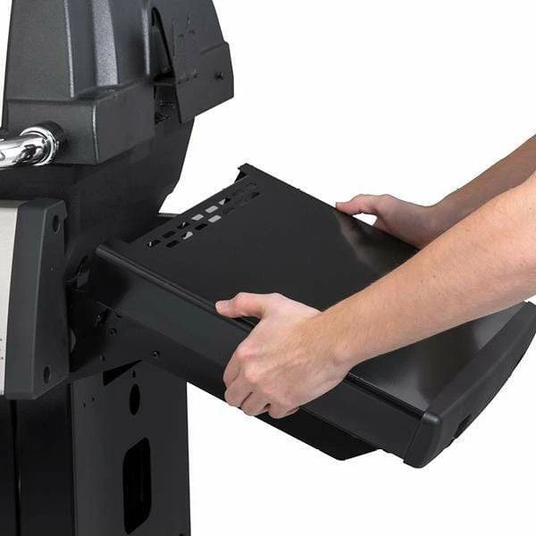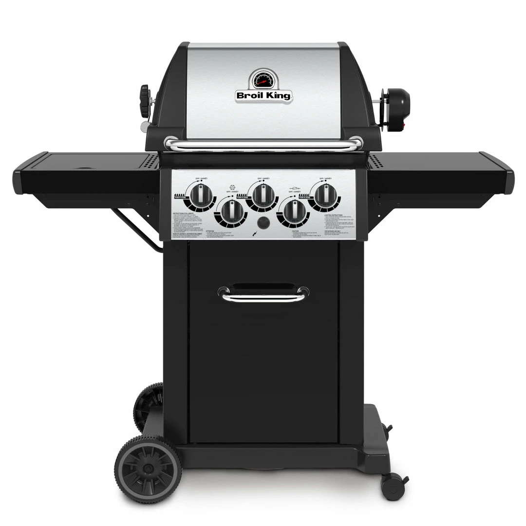 The Monarchâ„¢ 390 features 330 sq. in. primary cooking surface and includes 3 stainless steel Dual-Tubeâ„¢ burners, reversible heavy-duty cast iron cooking grids, stainless steel Flav-R-Waveâ„¢ cooking system, and electronic ignition. The Monarchâ„¢ 390 features painted steel drop-down side shelves and enclosed cabinet base.