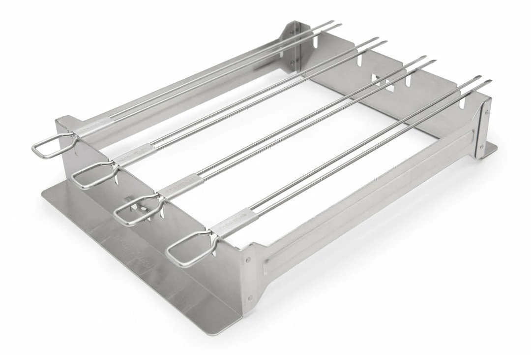 Covering slightly more than one standard grid segment this space-saving kebab rack holds 4 dual prong skewers at a time in two possible positions. Lay the skewers flat to keep them away from the heat or stand them vertically to get them close to or on the grill surface. Easy to clean stainless steel. Set of 4 – 12-in / 30.5 cm skewers.