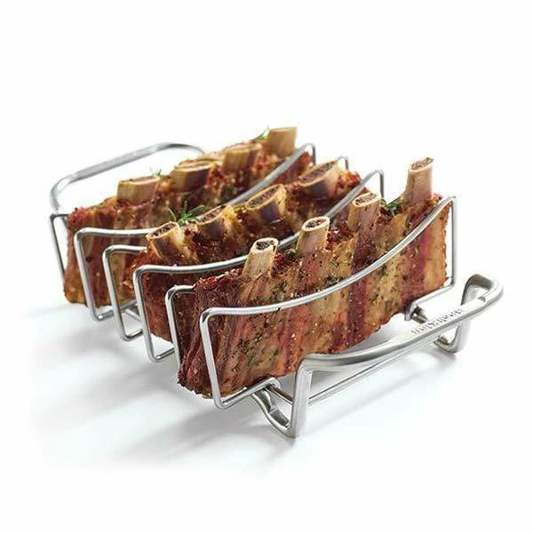 The Broil King Imperial professional rib roast rack accommodates 5 racks of ribs within an ultra-durable high-grade stainless steel wire frame. The multi-use design also accommodates large cuts of meat for roasting on the upper concave wire structure. Oversized 10 mm handles support the entire rack and allow it to be easily transferred from one part of the grill to another.