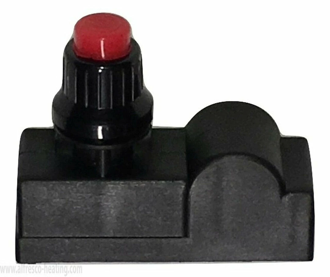 Black igniter with a red button used in the Bromic portable heater. Push and hold this igniter button after turning on the gas to turn on the heater.