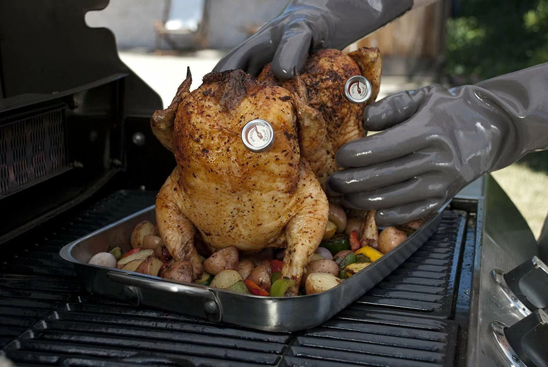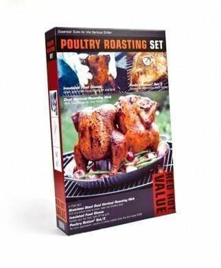 Set includes a pair of insulated food gloves, two poultry buttons, and a dual vertical roasting pan. Great for a serious griller as well as beginner. Also makes a great gift for any holiday.