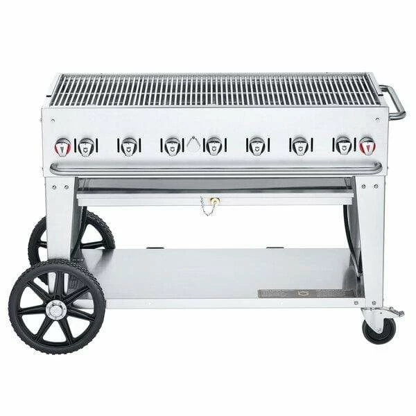 Cook high-quality grilled food at your next event with the Crown Verity CV-MCB-48-SI-50/100 liquid propane 48″ mobile outdoor grill with single gas connection and 50-100 lb. tank capacity! Whether you’re catering with it or hosting a big event at your hotel, this high-performance, stainless steel grill will withstand frequent usage while delivering excellent results. This grill utilizes a single-gas inlet (gas hose sold separately), and it’s adapted for 50-100 lb. propane tanks to give you hours of reliable performance. It boasts seven burners placed every 5 3/4″ to ensure the most even heat pattern possible, and it produces up to 114,000 BTUH. It heats to cooking temperature within five minutes, which means that you can unload the grill, set your prep space up, and get right to work with little wasted time.