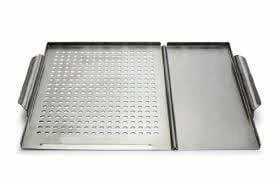 Dual-Surface Grill Topper, 12 x 17” / 30.5 x 43cm, stainless steel. Grill all your favorite foods at once. Dual surface is ideal for vegetables and shellfish on the perforated side and meat, poultry and fish on the solid side. Provides a smooth surface for grilling and prevents foods from falling through the grill rack. Easy to lift tray for simple transport from bbq to table.