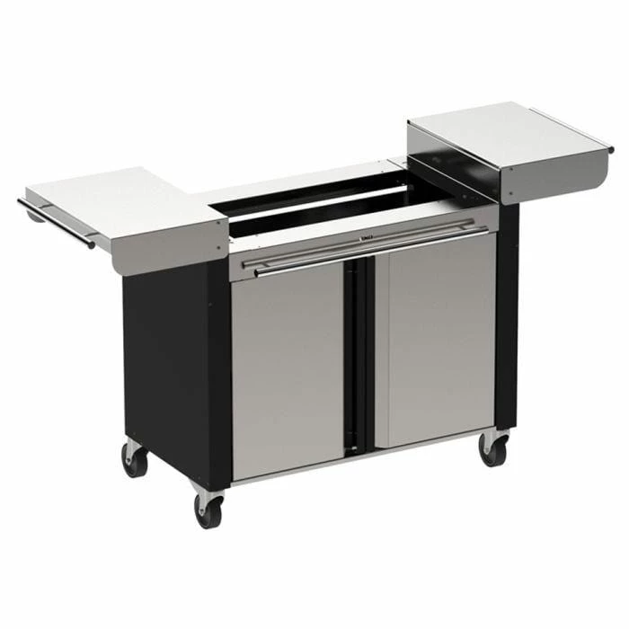 COMBO trolley for installing the Plancha 60, 75 – Stainless steel and black galvanized steel with powder coating – 2 folding stainless steel shelves – 4 mobile wheels.