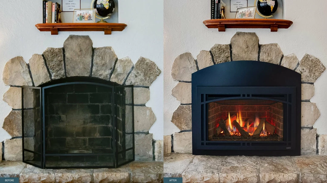 The Ruby series gas fireplace inserts make enjoying a fire easy. All the ambiance and warmth of a split-log fire, without the mess and hassle of wood. A traditional fireplace can be completely changed to a brilliant glass fire bed and driftwood logs. A fireplace to fit your lifestyle, whenever you want.