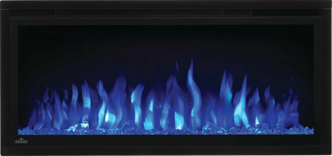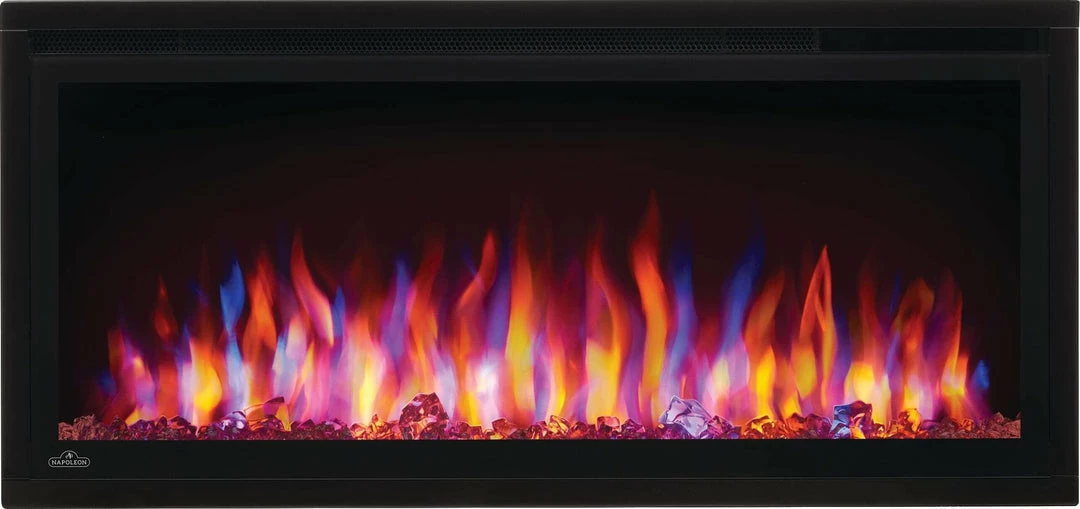 Make a statement with the Napoleon Enticeâ„¢ 36 Electric Fireplace. This fireplace puts out an incredible amount of heat, glittering with multicolored flames and a crystal ember bed. You don’t need a specialist or a gas fitter for this expansive beauty, just hang on the wall and plug in for instant transformation of your space. Traditional orange flames, or cool blue flames, or a combination of the two will set the mood. The shallow depth means that this fireplace doesn’t intrude into your living space, but simply accents it with the expansive view of the fire. Place this electric fireplace anywhere you want to make a huge impact, perfectly suited for either your home or a commercial setting.