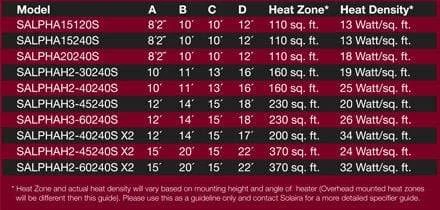 The new Solaira Alpha Series electric infrared heaters represent the evolution of engineered short wave heating technology. Alpha Series Heaters produce short wave length infrared that convert 85% of consumed energy to instant, controllable, directional heat. This heating technology is not affected by wind or draft as it warms people, objects and things and not the air. The modular design of the Solaira Alpha Series allows specifying engineers to adjust and direct specified heating loads based on area requirements. The Alpha Series modern, sleek design allows architects to integrate heating technology with clean un-intrusive lines. Alpha Series Heaters are engineered to meet IP55 standard for water spray so they can be installed in both wet (outdoor) or dry conditions (indoor or outdoor).