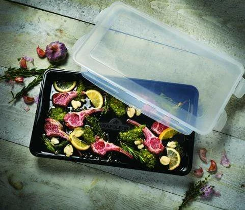 Heavy duty tray to marinate and prepare your meat with vegetables up front.