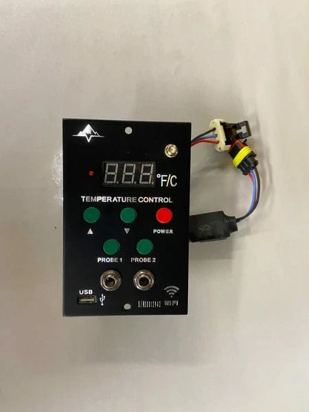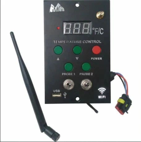 Green Mountain Grills Replacement 12 VDC Digital Circuit Board with WiFi for Green Mountain Daniel Boone Prime Plus Pellet Grills. This Control Panel is designed for precise temperature management with a 150°-550°F range with 5° increment control. Includes WiFi Smart Control, WiFi antenna, dual meat probe ports, and a USB charging port for charging only. Control and monitor grill and internal food temps to the degree and on-the-go from the GMG App with access to a huge selection of recipes and grilling profiles