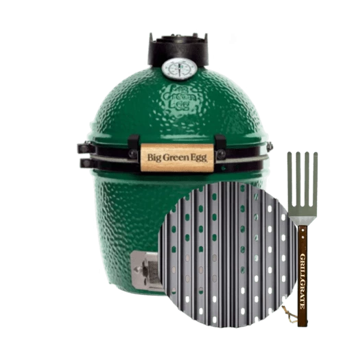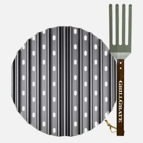 GrillGrates provide protected, high-heat grilling on the Small Big Green Egg. The bottom plate blocks hot rushing air and flames from charring and drying out food, keeping the juices sizzling with the food instead of feeding the flames. GrillGrates are used on top of the existing grate surface. Every set comes with a GrateTool which is part fork, part spatula that fits between the rails to get under your food and lift it without scraping.