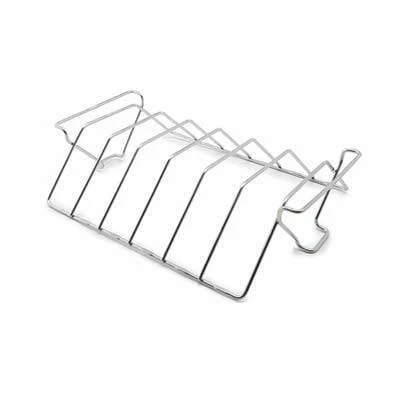 Reversible rib rack and roast support. Made of stainless steel with a frame that holds 6 racks of ribs and a roast support for large cuts of meat.