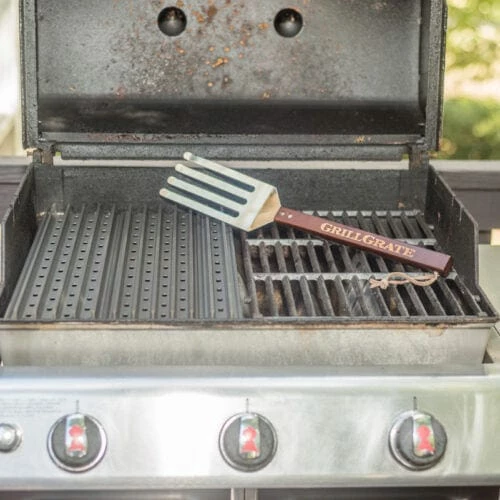 GrillGrates with the GrateTool are the ultimate upgrade to your older Weber Genesis®. GrillGrates are reversible interlocking panels, giving you two grilling surfaces; rails up or on the flat side. GrillGrates tame flare-ups and even out the hot and cool spots common with all gas grills. This gives you even, stable temperatures across the cooking surface. This set is a drop-in replacement for ONE of the stock Genesis® grates. This set will also fit the Summit® 420 and 470 and many other large gas grills. Constructed from hard anodized aluminum, GrillGrates will never rust. Made in the USA. The GrateTool is made in China.