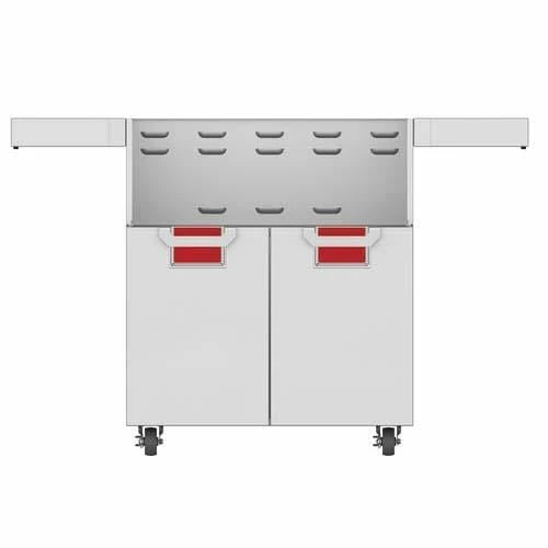 This grill-ready cart matches the 30” built-in grill in heavy-duty form and function. Fold-down side shelves offer extra work space when you need it. The two-door design allows easy access to gas tank and grilling tools. Commercial-grade casters deliver easy maneuverability.