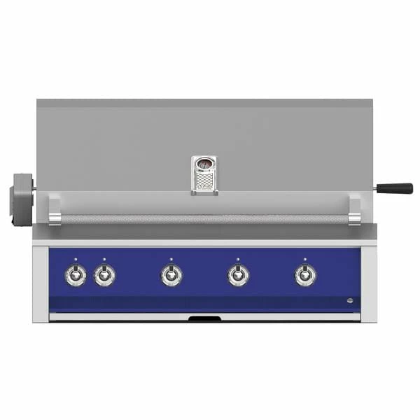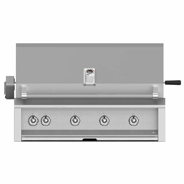 The Aspire by Hestan built-in grill with rotisserie adds even more culinary versatility to Aspire’s heavy-duty performance with an additional under-hood searing burner and stainless steel rotisserie. Each unit is built in California from heavy-duty American steel. More incomparable features include spring-assisted hood, variable infrared searing burner, dual halogen lighting and flip-to-clean ceramic briquettes. This grill has four burners.