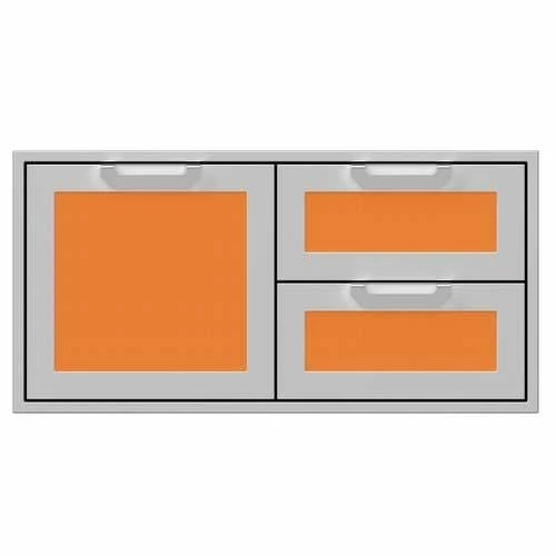 Combo door/drawers deliver highly convenient heavy-duty storage. The commercial-grade handles, recessed Marquise Accented™ panels and heavy-gauge welded body complement Hestan grills in form and function.