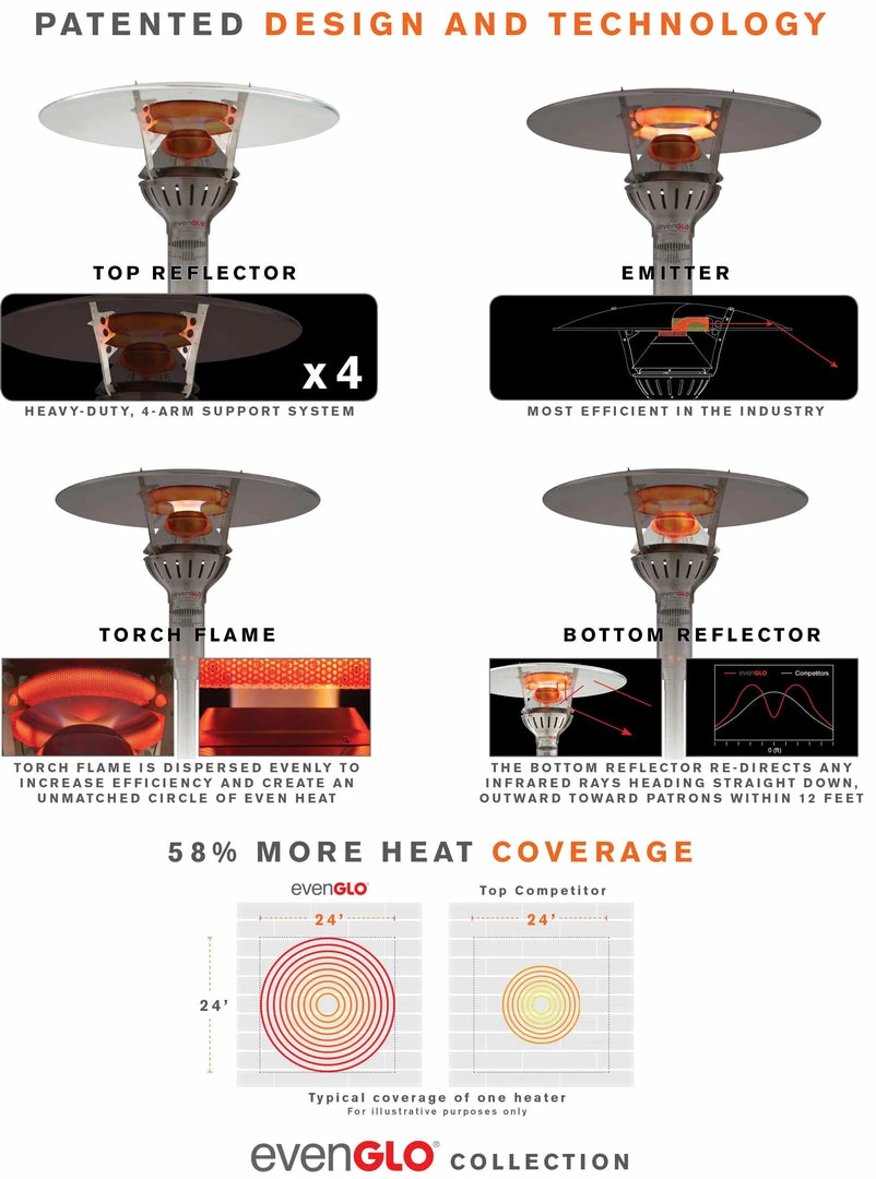 No matter what time of the year it is, keep guests warm with this heater offering up to 46,000 BTUs with comfortable heat coverage of up to 12 feet in radius. The bottom reflector evenly distributes infrared heat from the open flame which provides for a more efficient use of energy. The engineered positioning of the emitter results in more heat, more coverage, and more savings! The top reflector, which is made of heavy-duty spun aluminum, sports a 4-arm support system and a polished surface that guarantees no warping and ensures optimal heat dispersion to the surrounding area!