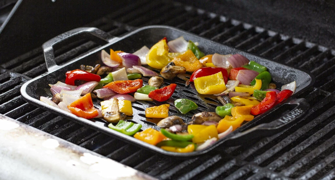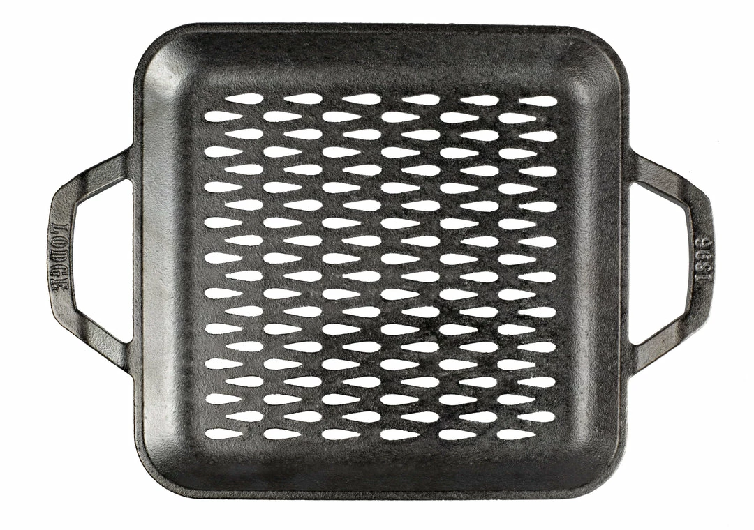 Turn your grill into a short-order kitchen with this square grill topper. The perforated holes in the signature teardrop design infuse food with that delicious grill flavor and the comfortable, lifted handles make it easy to maneuver as you cook. Seasoned and ready to use for an easy-release finish.
