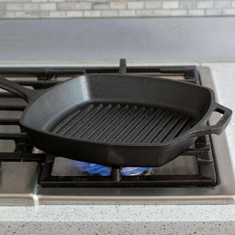 Get even more cooking surface with the 10.5 Inch Square Grill Pan. The ribbed surface allows fat to drain from food while also searing tantalizing grill marks onto your food. Featuring both an assist handle and an easy-grip handle for great control and hanging storage, it provides excellent heat distribution and retention for consistent, even cooking. Seasoned and ready to use.