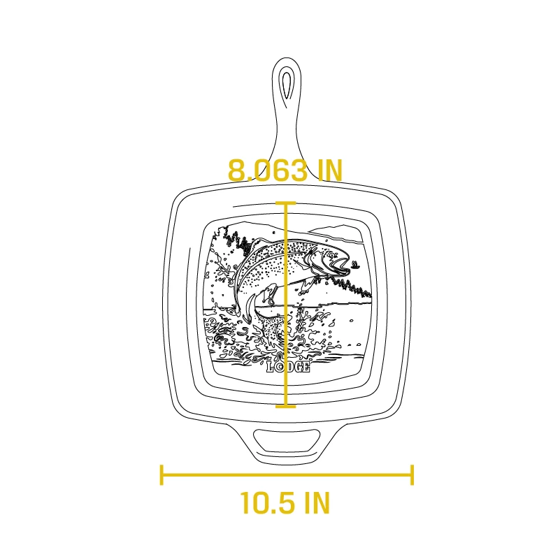 The Wildlife Seriesâ„¢ celebrates some of America’s most iconic and distinctive game animals in a piece that’s both functional and collectible. This 10.5 Inch Fish Grill Pan allows fat to drain while also searing tantalizing grill marks onto food. The bottom of the pan features a cast image of a fish that makes a beautiful display. It provides excellent heat distribution and retention for consistent, even cooking. Seasoned and ready to use.