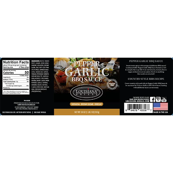 Sweet meets spicy in this unique and delicious BBQ sauce! The Louisiana Grills® Pepper Garlic BBQ Sauce features a rich and complex flavor profile from real Sriracha, tomato, brown sugar, molasses and savory spices. Use it on anything that needs an extra kick!