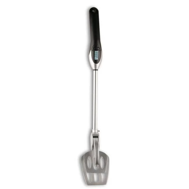 Maverick Industries, Inc. is a New Jersey based distributor of Food Preparation Appliances & Kitchen Timers, Digital Thermometers & Probes, Bi-Metal & Basic Thermometers, Digital Forks & Probes, and Grill Accessories. 22” long handle keeps fingers away from the heat. Large spatula for easy scooping of any single portion food. Unique claw with piercing thermometer probe tip. Easy to read LCD displays food temp. Set the temperature for desired food doneness. Slide food onto spatula. Pull trigger so claw pivots and thermometer probe tip pierces food. Wait a few seconds. The LCD will display food temperature. If food temperature is above set temperature, the unit will give an audible alert.
