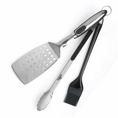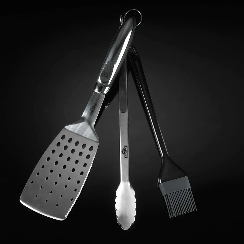 Napoleon Stainless steel with black handles three piece grill toolset includes spatula, locking tongs and basting brush. These quality made, long lasting tools with ergonomic handles will make you look and feel like a professional griller.