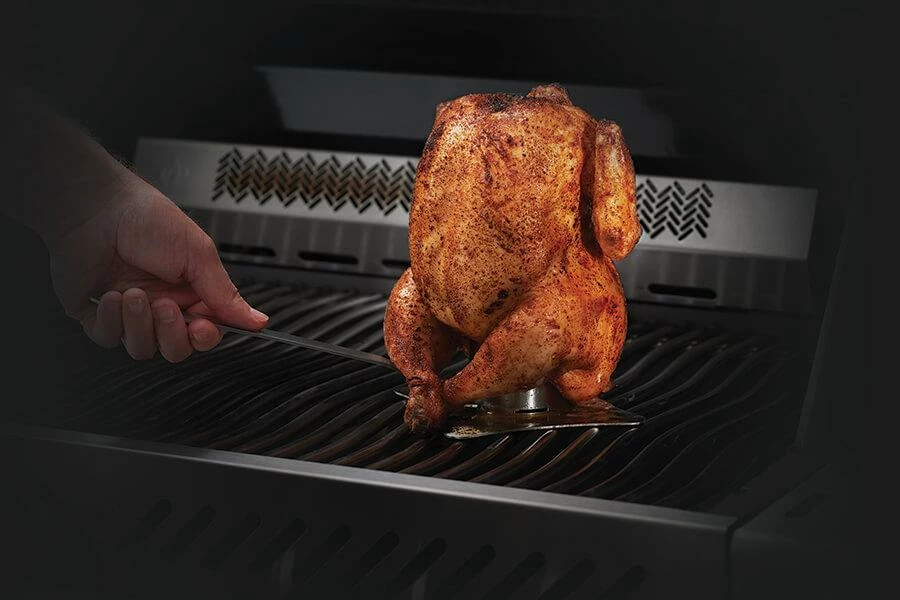 This stainless steel chicken roaster is a compact cooking tool that brings big flavor. The container holds 250 ml (1 cup) of your preferred liquid for sumptuous beer can-style chicken. Get creative and try juices, wines, or other liquids. The sturdy, removable handle makes moving your meal safe and easy while freeing up valuable grill space. This chicken roaster is also dishwasher safe.