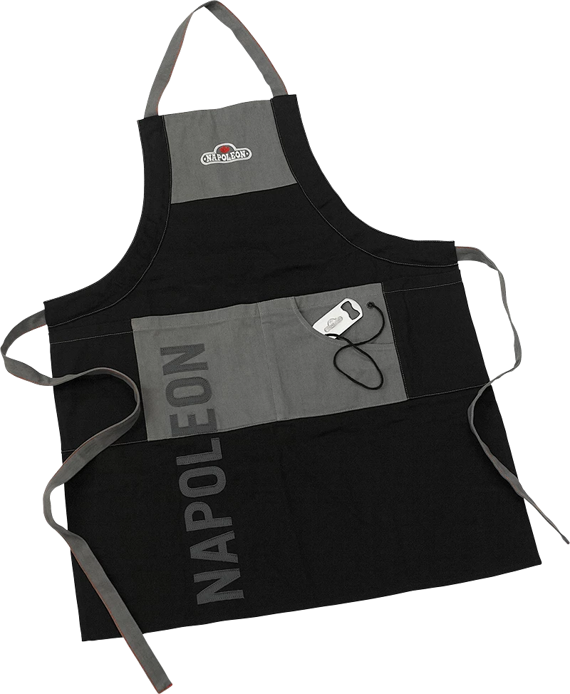 Grilling isn’t always a clean job. Protect yourself with a Napoleon Grilling Apron and show your love for your Napoleon Grill! The heavy-duty canvas protects you and your clothing from splatters, spills and spitting food as you grill up a storm. Fashionable in black and grey, with Napoleon in big letters, this one size “ fits most, apron will match you, your grill and your outfit. Keep your favorite tools handy with the large front pockets. Make sure that you’re the grill master with the handy added bottle opener too.