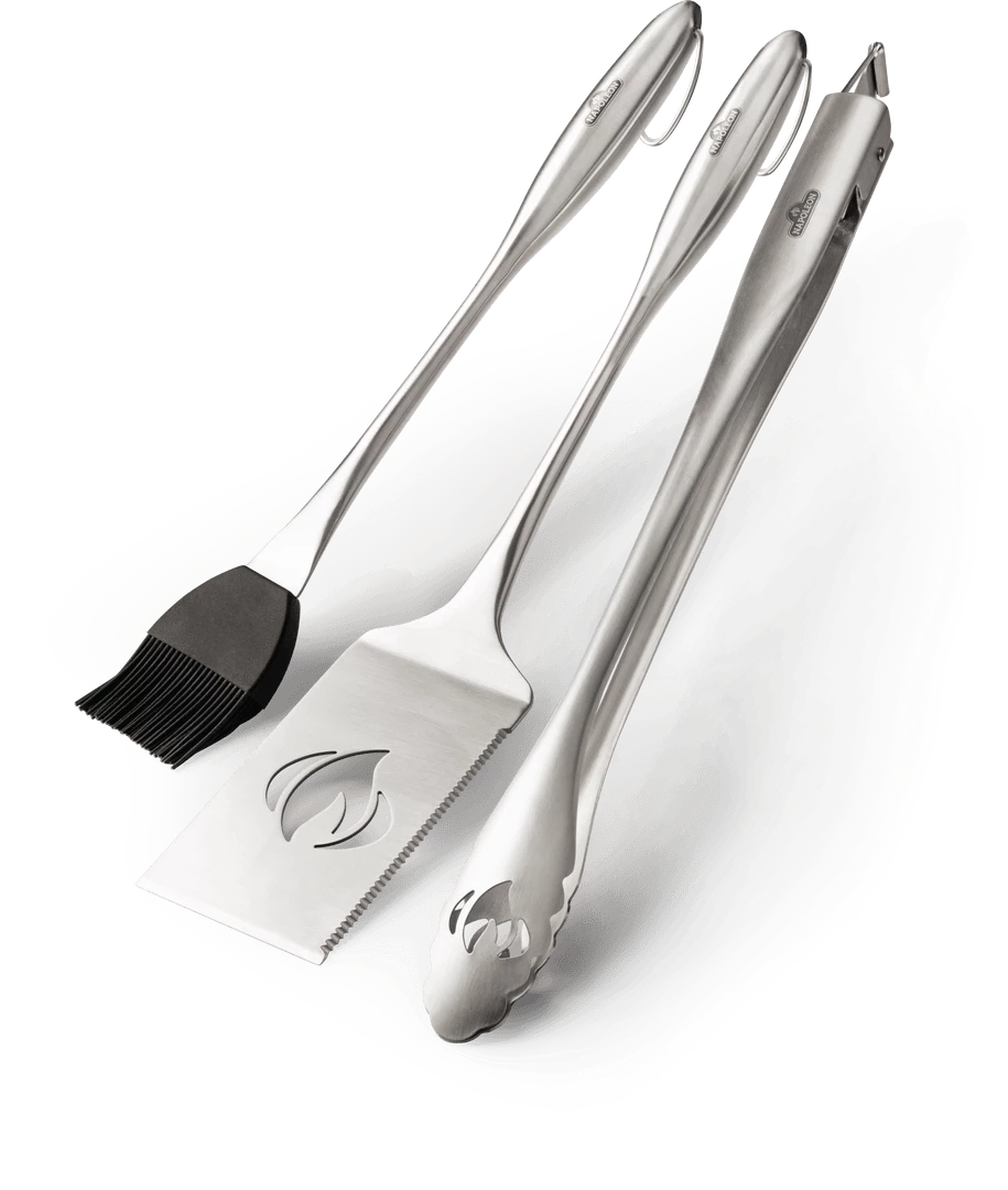 Elegant and easy to use Napoleon’s PRO Stainless Steel 3 Piece Toolset has everything you need to master your next barbecue. The curved handles sit lightly and comfortably in hand while you grill up a feast. Easily hang your PRO Stainless Steel 3 Piece Toolset with the oversized loops for storage on your grill’s tool hooks. The spatula features an extra long face, bladed tip, and serrated edge for easy moving and flipping. The tongs are sturdy, easily locking and unlocking so you’re always ready for BBQ action. The silicone basting brush lets you safely slather on the sauce, and cleanup is a breeze because it’s dishwasher safe.