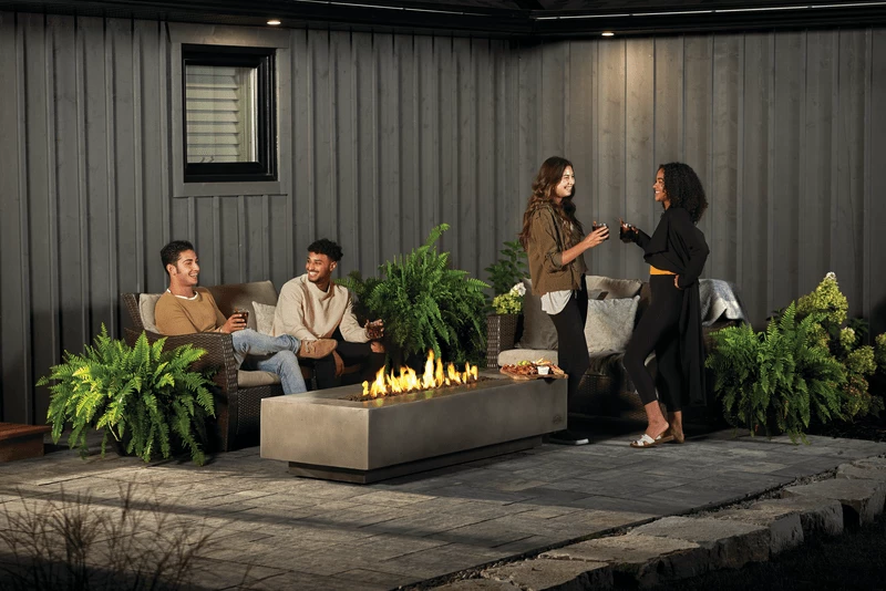 Napoleon Nexus 72-inch rectangle table. Table is cast aluminum construction that looks like formed concrete. Premium stainless steel burner with lava rock media. Option to natural gas through a conversion kit. NG Conversion Kit available – sold separately. Cover included.