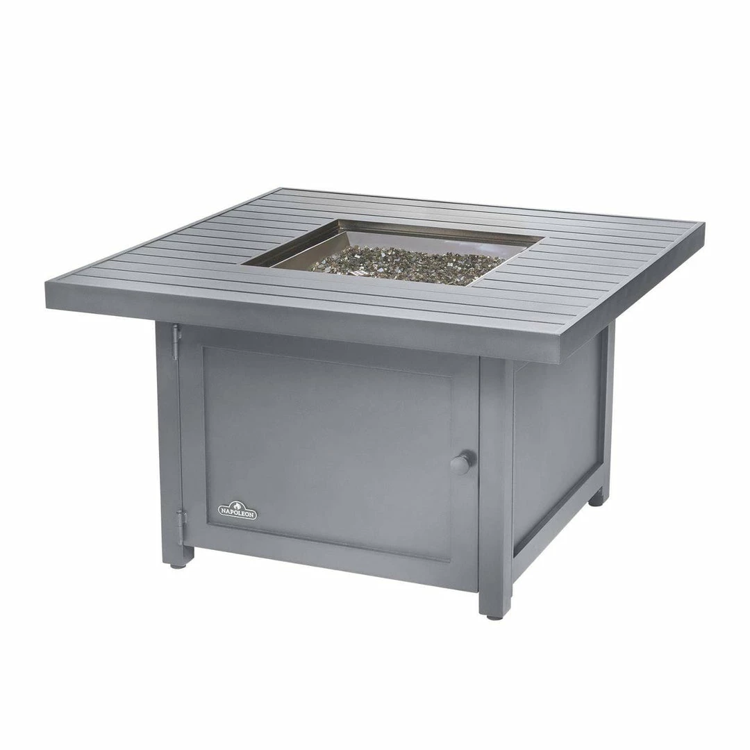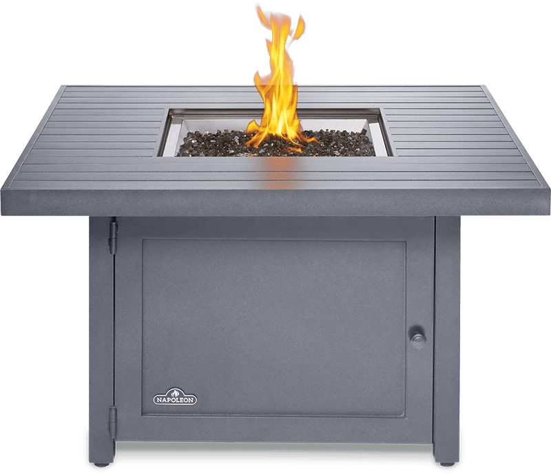 A stylish, contemporary design sets the Napoleon Hamptons Square Patioflame® Table apart from the rest. The stylish linear design with a contemporary look to suit any décor. Safe and fuel efficient, the Hamptons Square Patioflame® Table features a thermocouple valve that cuts the gas when flame is interrupted, meaning that if a gust blows the flame out, or you forget to shut the gas when you’re done, no gas will be wasted. The beautifully constructed, durable, aluminum surround conveniently hides a gas tank (propane models). Never worry about the weather, drainage holes in the burner pan allow the rain to drain away, and the optional windscreen will protect the flames from the wind. Set your drinks down, converse in comfort and enjoy your outdoor living space. Easily convert your Hamptons Series Square Patioflame® Table into a fully functioning table with the burner lid (included).