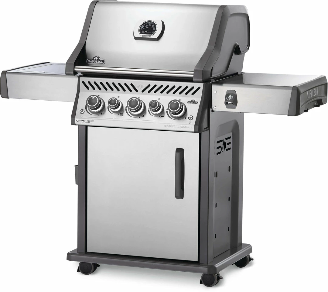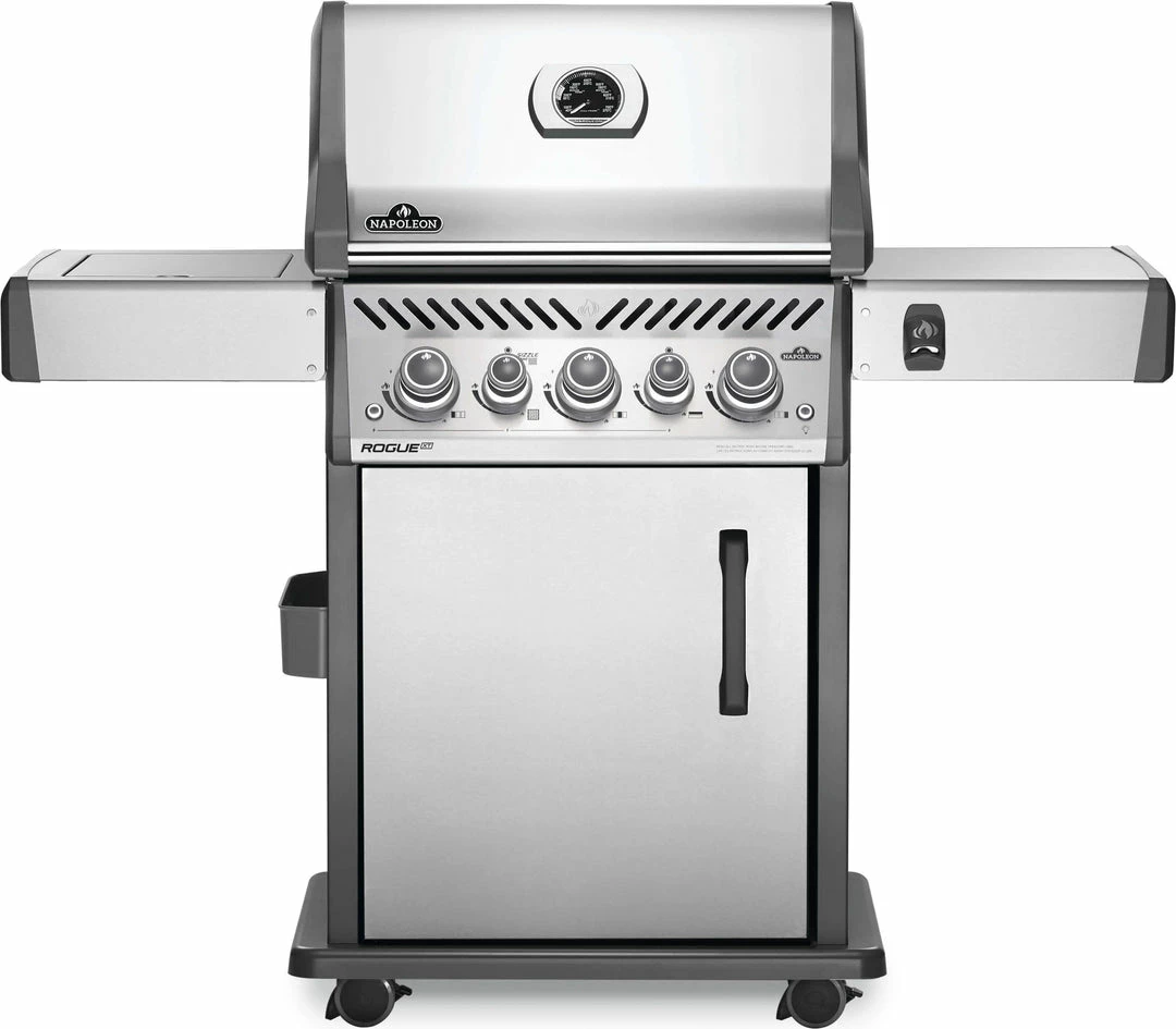 The Napoleon Rogue® SE 425 RSIB BBQ with Infrared Side Burner and Rear Burner available in Stainless Steel is a durable stainless steel grill. Featuring three main burners, a rear rotisserie burner, and a high top lid, this grill has everything you need to create gourmet meals. Sear restaurant-style steaks on the integrated sear station, while generous side shelves provide plenty of prep space.