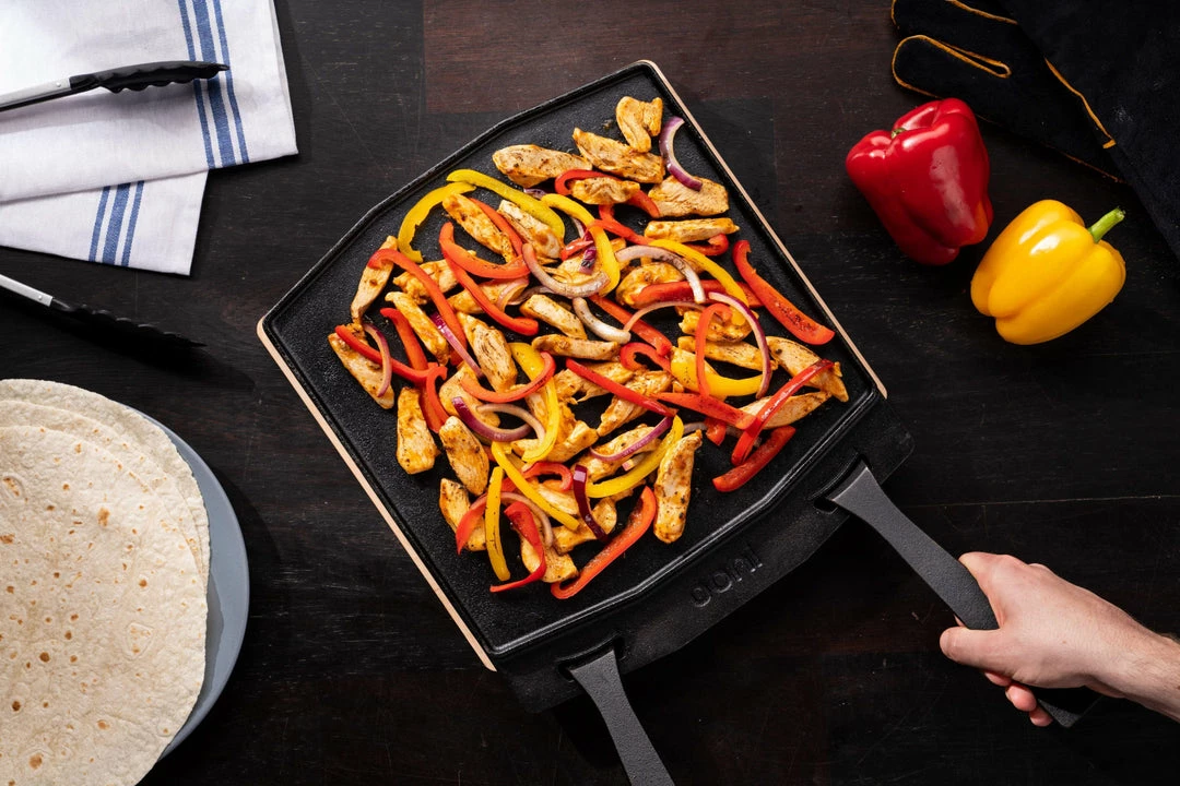 Is it a Griddle? Is it a Sizzler? It’s both! Say hello to the Ooni Dual-Sided Grizzler Plate. Use the versatile smooth Sizzler side for fajitas or frying eggs, or flip and use the Ooni Grizzler ribs for those picture perfect seared grill marks on the meats. Use the bespoke designed removable handles to safely move the Ooni Dual-Sided Grizzler Plate in and out the oven when hot, or serve it straight to the table on the included beech wood serving board.