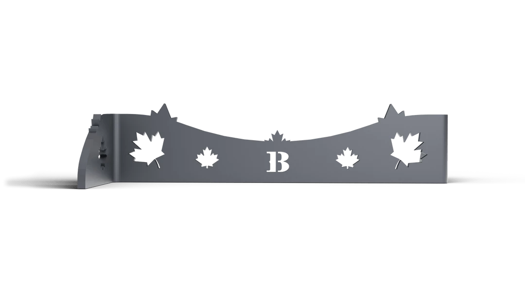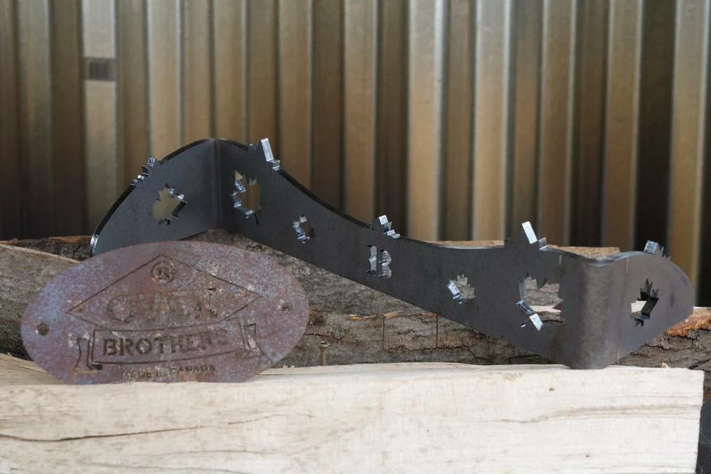 The trendy Oven Brothers log holder. Made of sturdy laser cut carbon steel, this holder will hold your wood in place with its maple leaf spikes and shape. Behold the Holder!