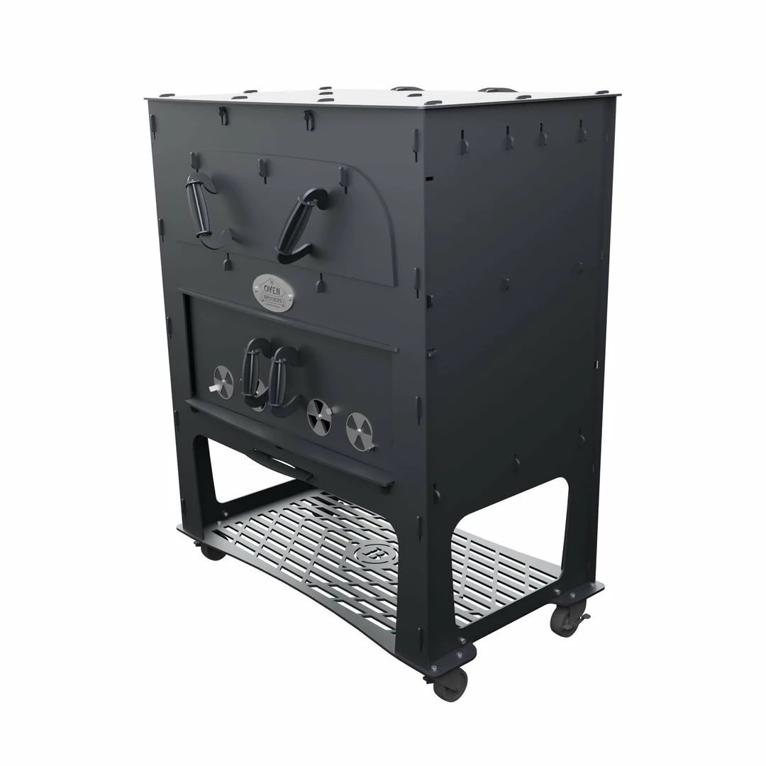 A two-person approach to assemble our ovens is recommended. We proudly achieved a “no tools, no hardware” assembly process with our unique interlocking design allowing for an assembly time of an hour and a half or less. Plus, it comes with a custom wheel kit which allows for greater mobility & versatility.