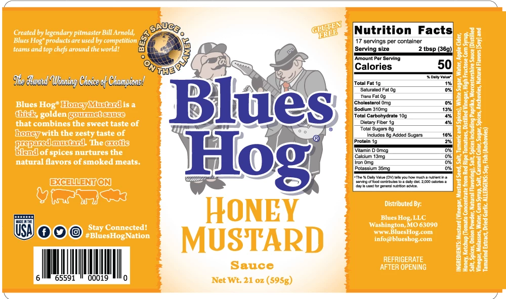 Blues Hog Honey Mustard is a thick, golden gourmet sauce that combines the sweet taste of honey with the zesty taste of prepared mustard. An exotic blend of spices nurtures the natural flavors of smoked meats. Blues Hog Honey Mustard is excellent as a dipping sauce, a basting sauce, or even as a delicious salad dressing! GLUTEN FREE.