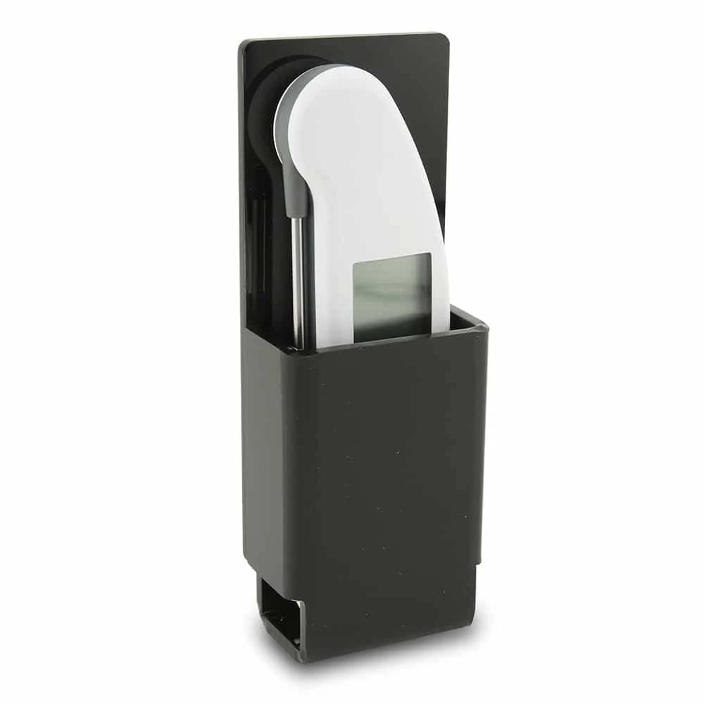Black acrylic wall bracket with wall-mount hole (screw not included). Great for storing Thermapen by grill/oven for daily use. Fits Thermapen with or without silicone boot installed.