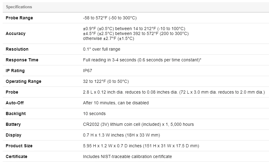 From the factory, DASH Mini should read within ±0.9°F and a calibration adjustment should never be needed. However, you can fine tune your calibration at a single point for even better accuracy. DASH Mini’s 2.8-inch probe is great for thick or thin portions with readings within 3-4 seconds.